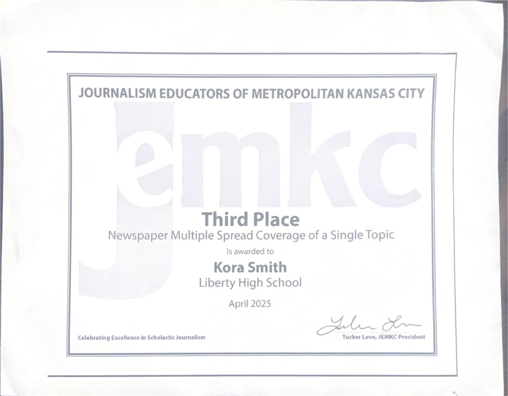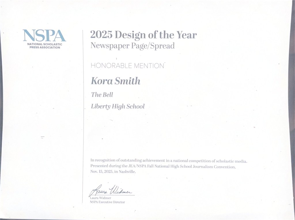 I am a senior at Liberty High School, located in Liberty, Missouri. Currently, I am the Editor-in-Chief of The Bell newspaper. I joined The Bell in August of 2023 and will continue through May 2026. Throughout my time on staff, I have made my contributions to the paper such as reporting, designing and editing. I have built leadership skills and have experience with Adobe InDesign and Illustrator.