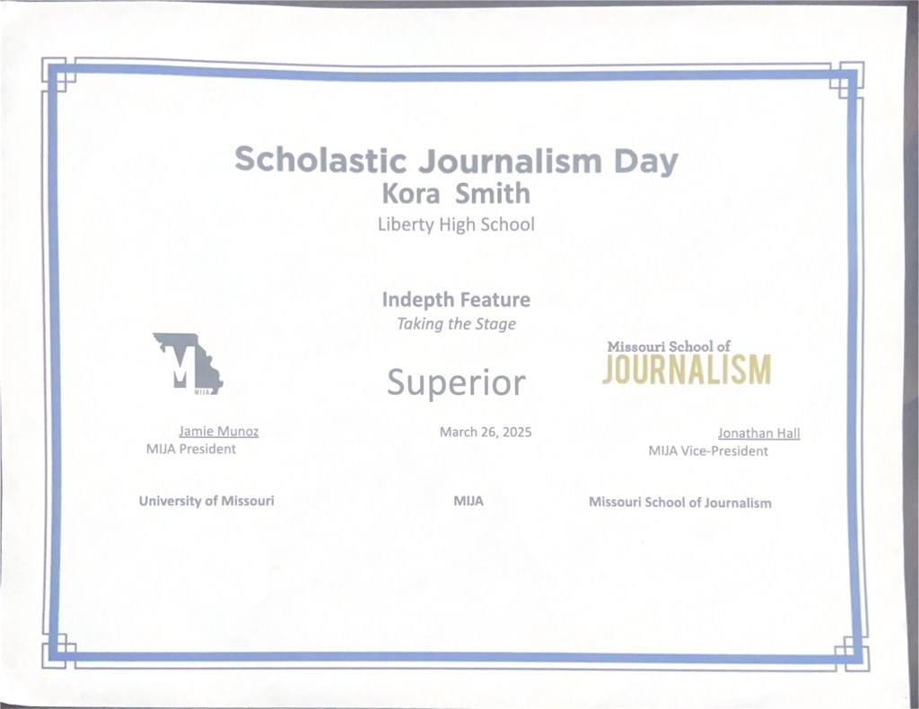 Award for my story, “Taking the Stage”, at Scholastic Journalism Day at Mizzou.